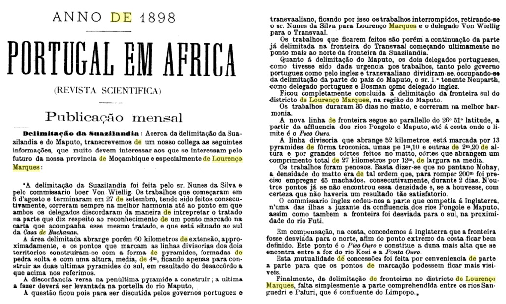 Este texto devia ser históricamente muito relevante para Moçambique pois explica como o célebre "do Rovuma ao Maputo" se tornou possível. Tratava-se aqui de definir as fronteiras sul e oeste de Moçambique na região a sul da cidade de Lourenço Marques e em que estavam envolvidos os territórios britânicos da Suazilândia e do Transvaal. No que se refere à fronteira sul actual, como se vê ela ficou estabelecida em 1896/97 pelo paralelo (ao equador) do Pico do Ouro um pouco a sul da Ponta do Ouro.